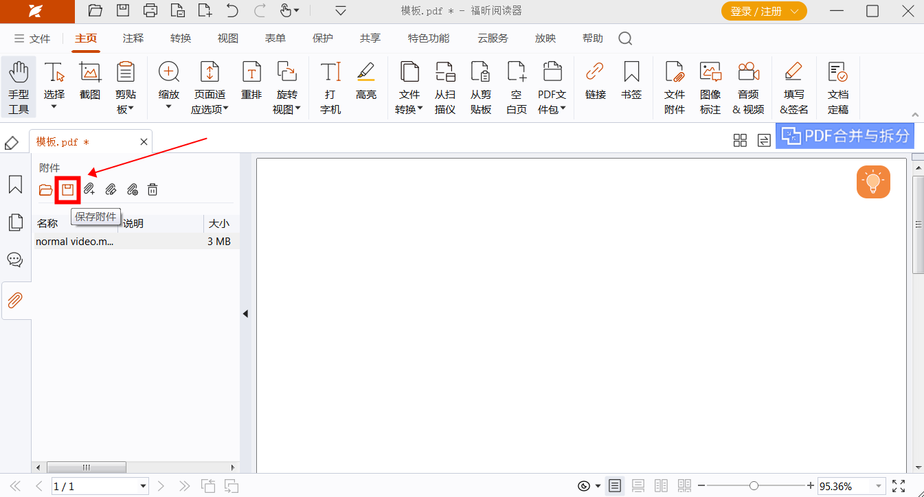 我们完成PDF文档的导入后,在PDF阅读器的左侧工具栏找到附件面板的图标,点击之后就可以看到PDF文档里的所有附件。
