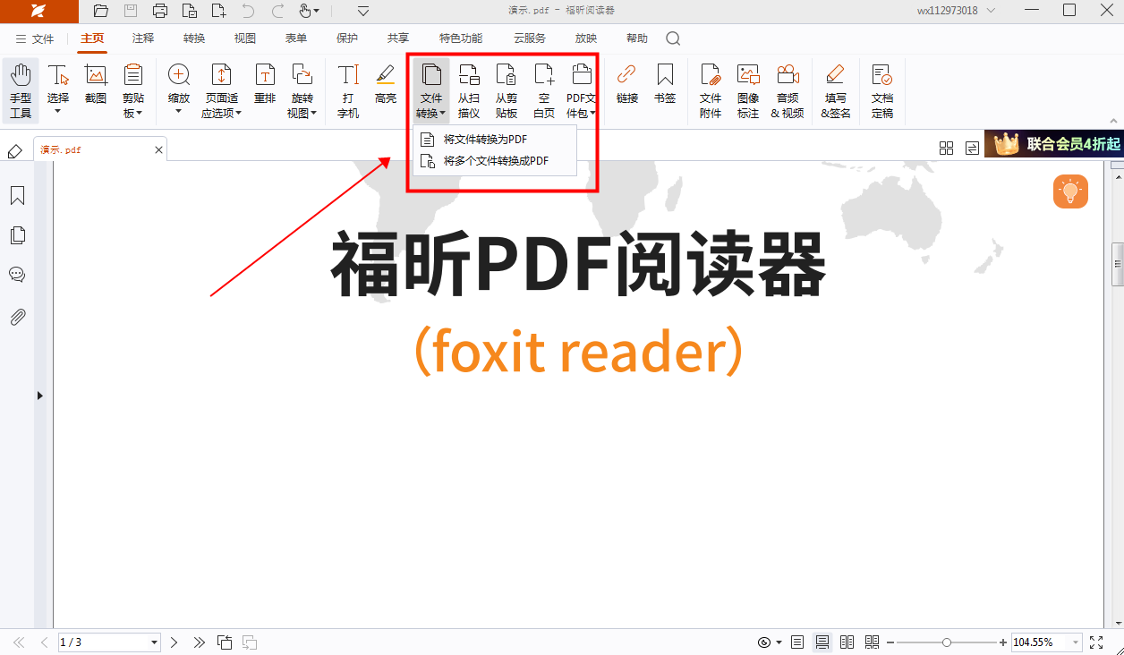 完成上一步操作之后,按下图所示点击“转换”栏里的“文件转换”的选项,再选择“多文件转换成PDF”,就可以将多个文件批量转为PDF文件了。