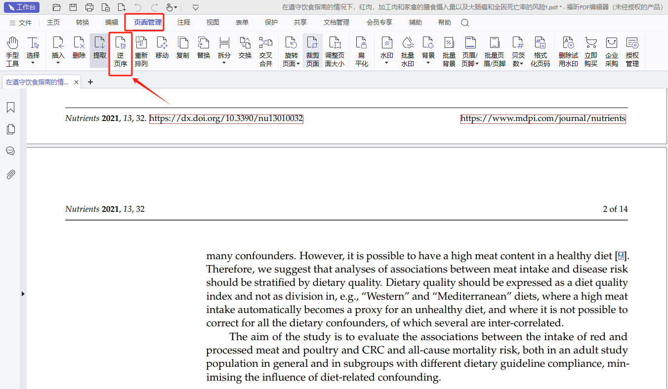 点击工具栏上的【页面管理】,点击其中的【逆页序】图标,然后我们就可以进行后续操作啦。