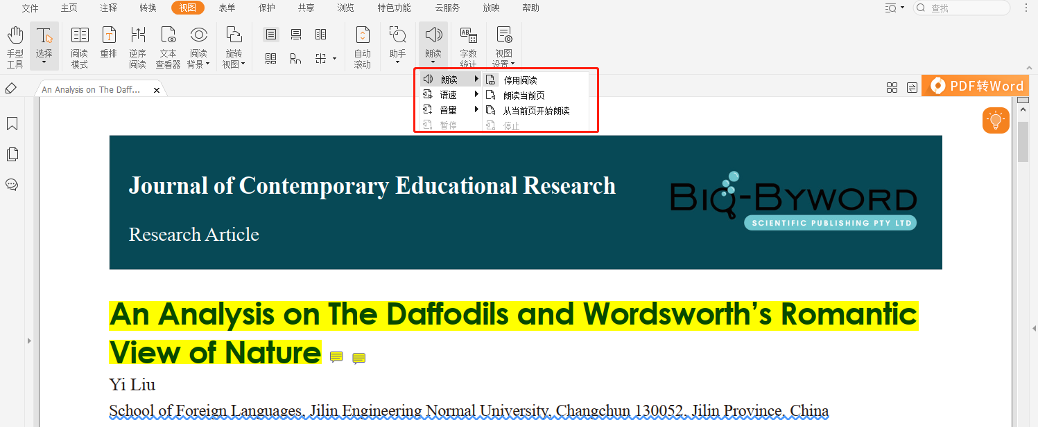 这款PDF朗读工具,不仅支持中文PDF的朗读,也支持英文PDF的朗读,激活阅读后,我们可以在这里设置朗读的语速和音效,也可以随时暂停朗读。