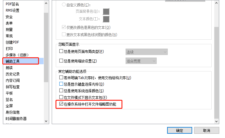 2、选择“辅助功能”标签,在“其他复制选项”中勾选“在操作系统中打开文件缩略图功能”。
