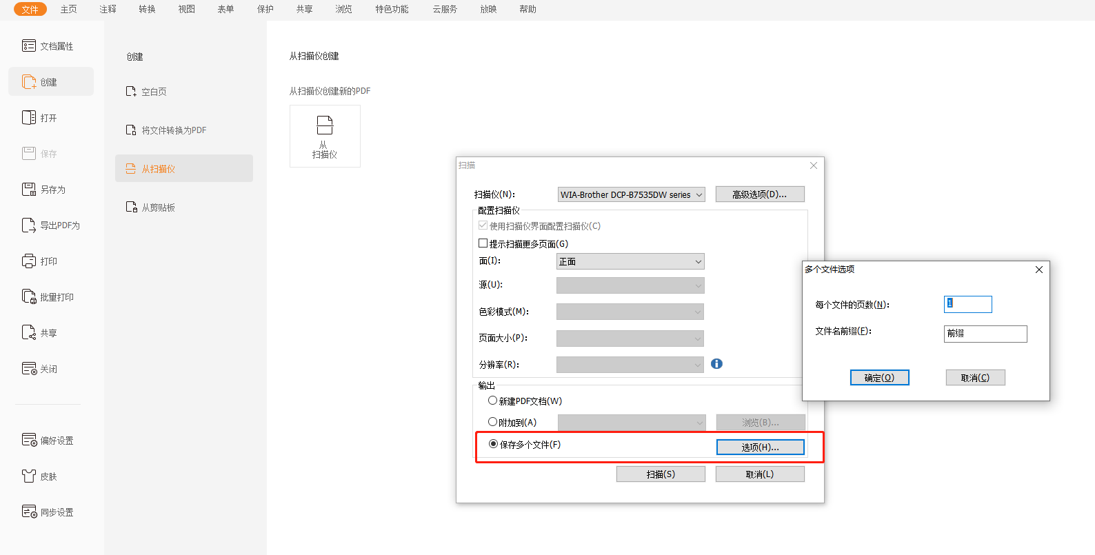 - 阅读器怎么扫描多页,可以点击“文件-创建”选择从扫描仪创建,我们可以在输出这里设置将扫描PDF输出为多个PDF文件