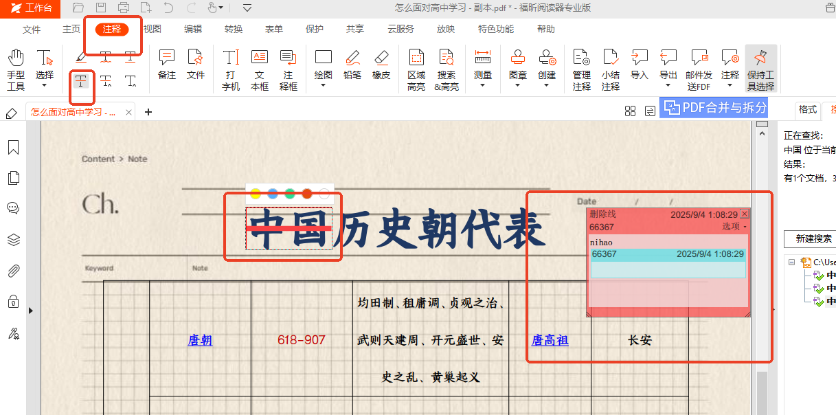 第二步:点击上方的注释功能中的删除线选择需要替换的内容后,在备注中填写需要替换的内容。