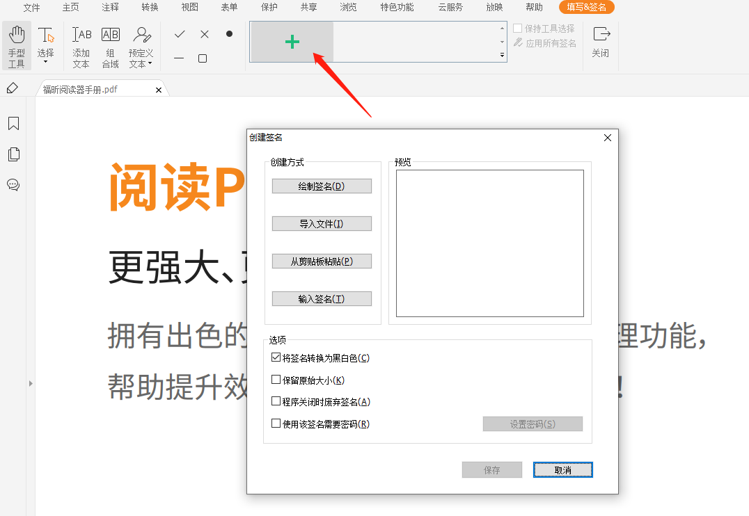 点击上方工机具中的【填写&签名】,点击签名中绿色的【+】键,再点击【绘制签名】,然后在白板上绘制自己的签名,完成后点击【确定】就可以生成签名了;
