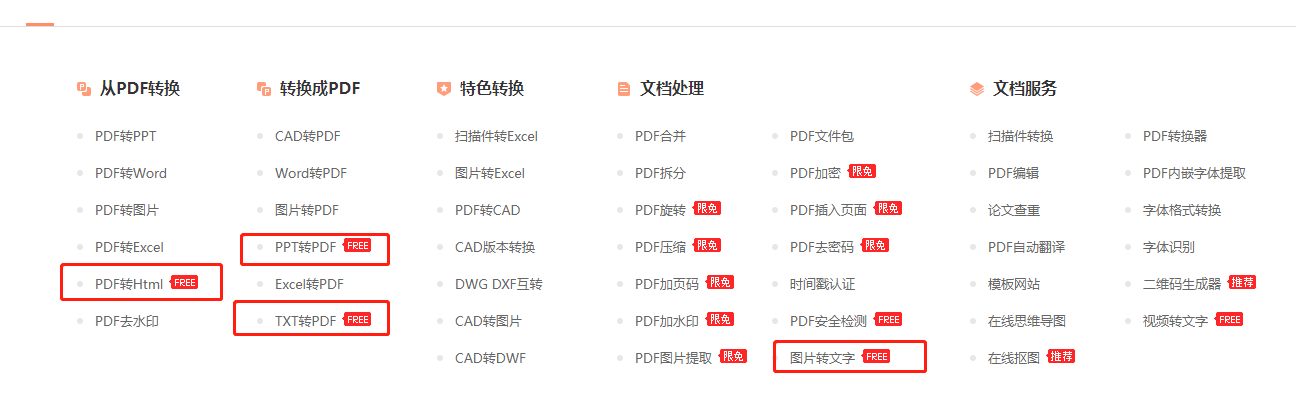 在主页我们可以看到TXT转PDF,图片转文字、PPT转PDF,PDF转HTML等这些功能都是免费使用的!轻松完成网页在线PDF转换。