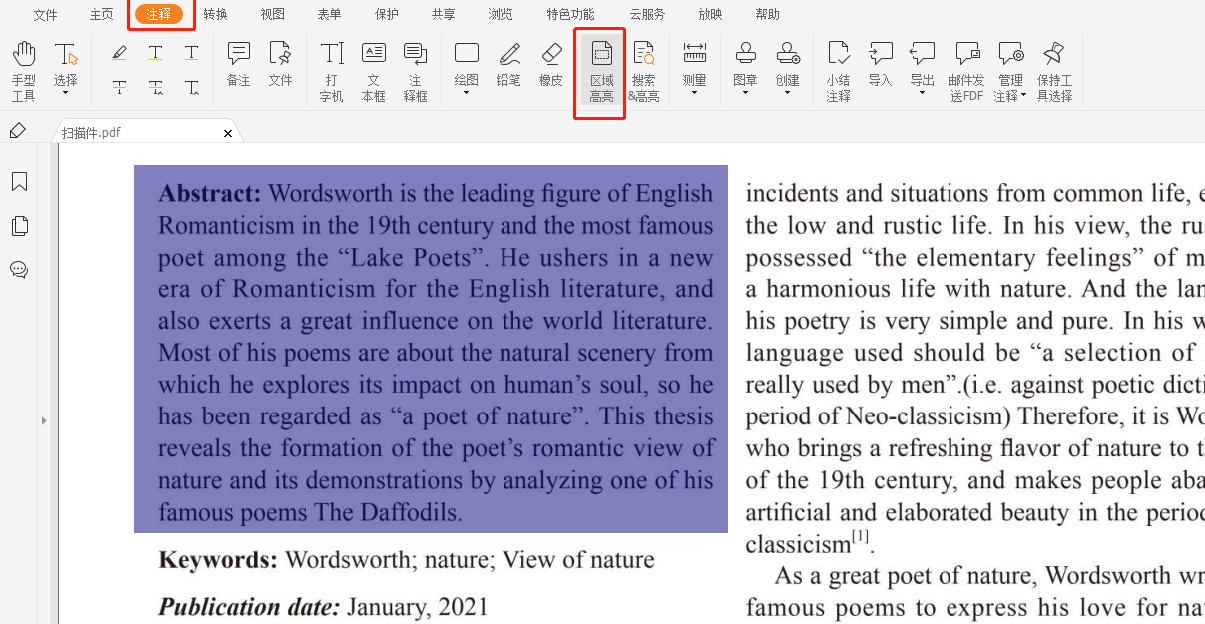 安装完成后,打开一份PDF文件(扫描件),在工具栏找到【注释】,点击区域高亮后,选择范围即可