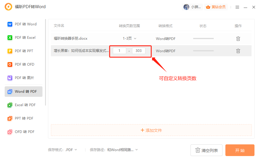 第三步:设置需要转换的页数,例如只转换这份word文档的前三页为PDF格式,点击自定义,输入1-3