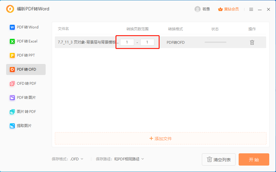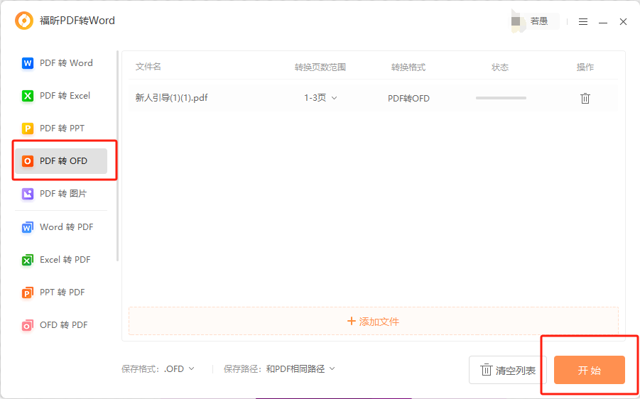 此时,软件会调出PDF转换格式插件,在界面左侧选【PDF转OFD】功能,再点右下角的【开始】,即可将PDF转成ofd。
