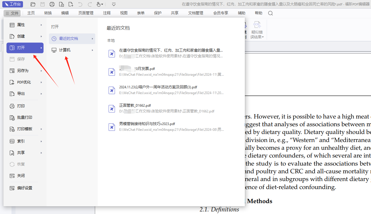 打开 PDF阅读器软件后,点击文件,点击打开,打开想要转换格式的PDF。