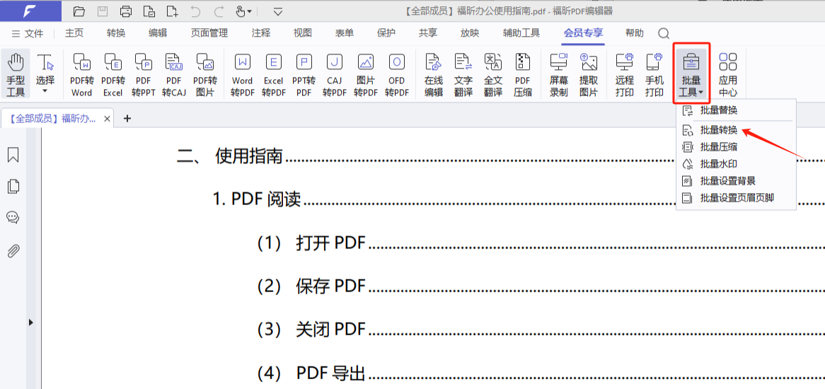 点击工具栏【会员专享—批量工具】,选择批量转换