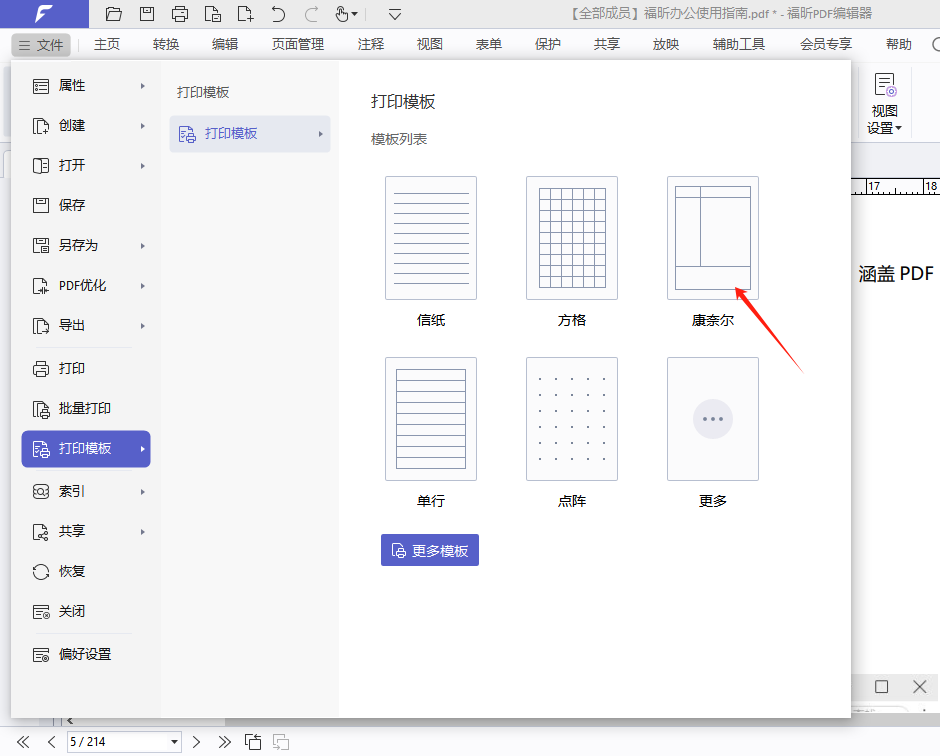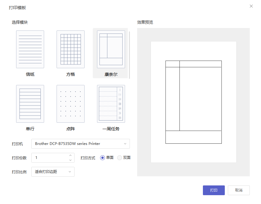 点击工具栏【文件—打印模板】,选择“康奈尔笔记”