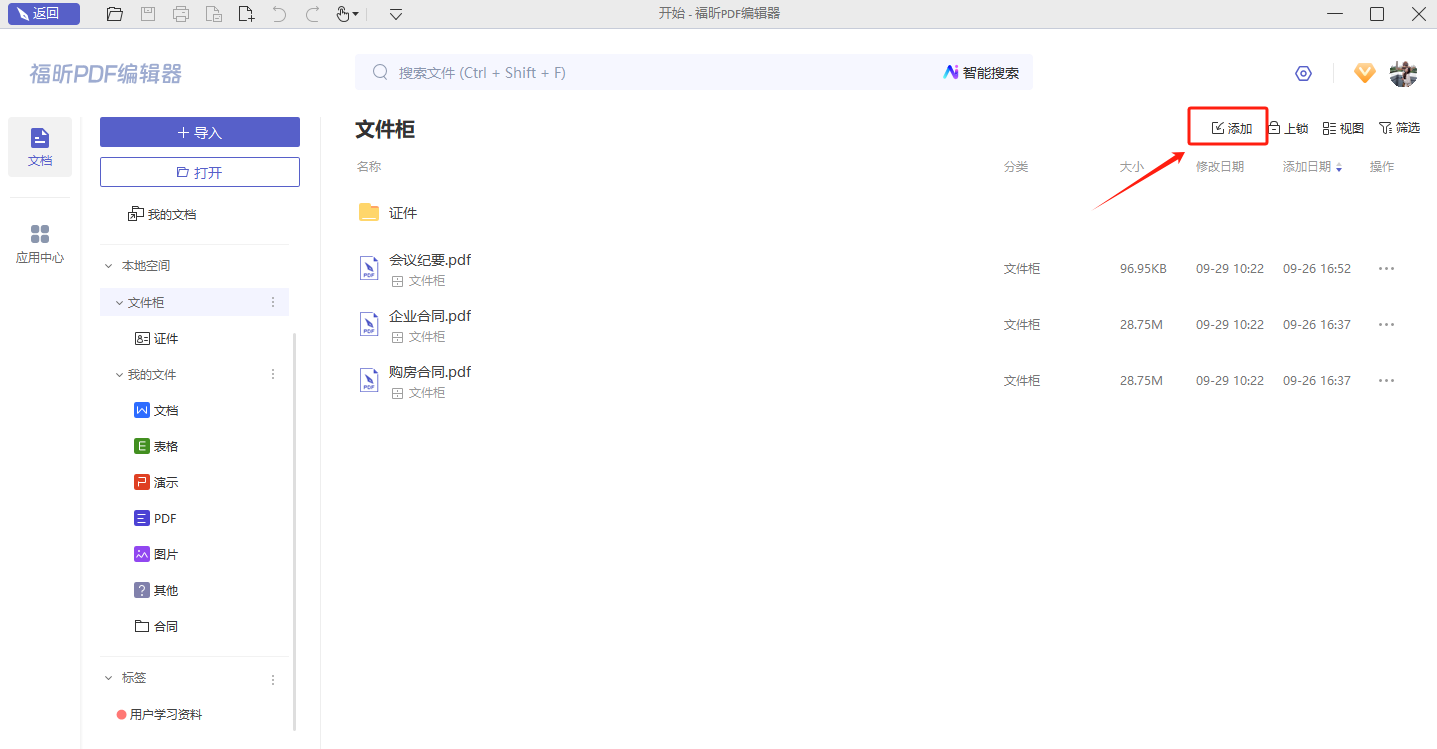 进入文件柜后,可点击右上方的“添加”,将更多重要文件添加至文件柜中