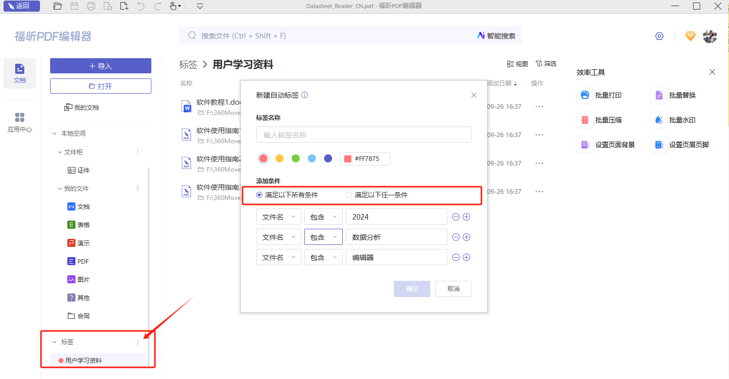 除了可以设置标签名字和颜色外,我们可以预设【关键词】,可选择满足以下条件或满足以下任一条件自动添加