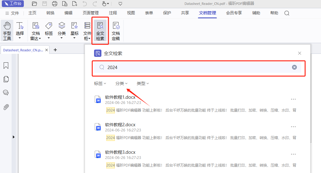 点击工具栏【文档管理】-【全文检索】,输入关键词进行查找