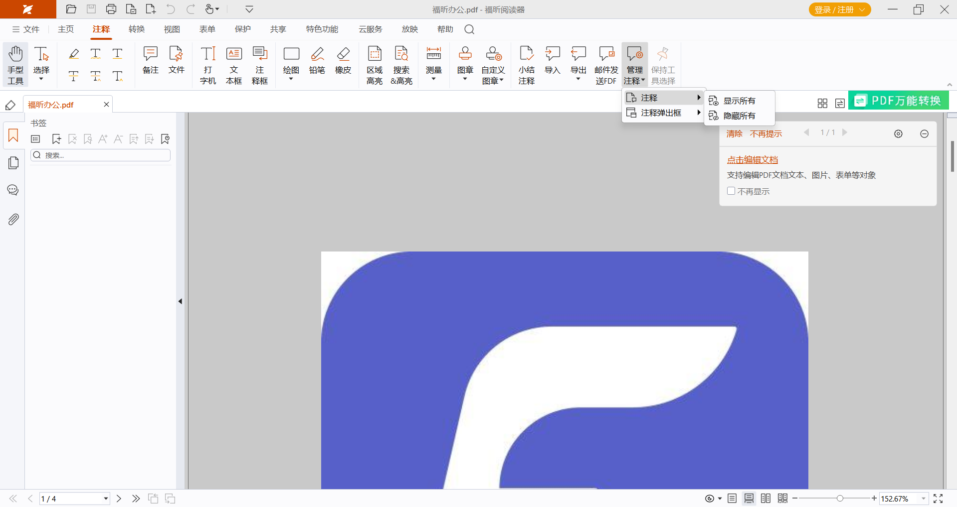 打开PDF文件后,点击【注释】中的【注释管理】,然后选择【注释】中的隐藏所有,就可以将PDF中所有的注释隐藏起来,如果需要显示的话,同样的步骤然后选择显示所有就可以了。